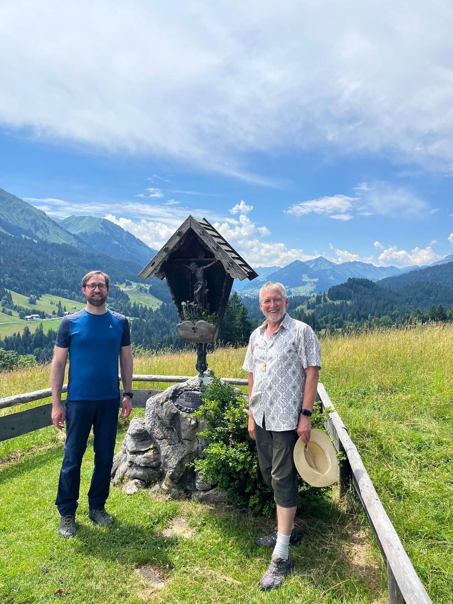 An der Hinteren Enge hatten Doris, Karoline und Herbert eigens für die Pilger die Hütte geöffnet und wir genossen eine besondere Gastfreundschaft. Ihr schöner Gesang hat uns, mit dem Blick auf das Kleinwalsertal und seine 4 Kirchen, berührt. Am Kreuz gestaltete Edwin die Station und die gelebte Ökumene ist wohl auch auf dem Bild zu sehen. Das Pilgern an diesem Tag war teilweise aufgrund der Hitze recht beschwerlich. Feinen Schatten auf dem Weg gab die Nähe der Breitachklamm, besonders dankbar waren wir für die Kühle der Tiefenbacher Kirche und selbst in der kleinen Kapelle im Ried fanden wir Schatten und eine weitere Bessinnung. Ziel unseres Weges war die Schlussandacht mit schönen Liedern in der evangelischen Kirche „zum guten Hirten“.